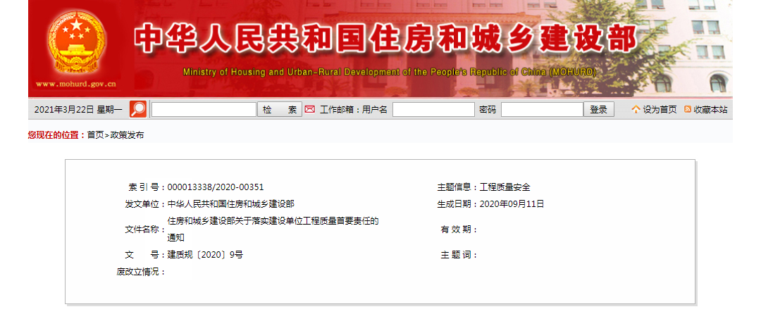 2020年9月23日,住建部官網(wǎng)發(fā)布《關于落實建設單位工程質量首要責任的通知》,嚴格落實建設單位工程質量首要責任。同時提出: