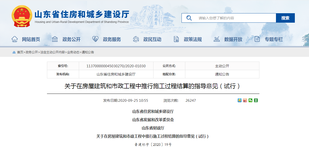 2020年9月17日,山東省住房城鄉(xiāng)建設廳、省發(fā)展改革委、省財政廳三部門聯(lián)合印發(fā)《關于在房屋建筑和市政工程中推行施工過程結算的指導意見(試行)》,通過規(guī)范結算行為,縮短結算周期,減輕企業(yè)負擔:
