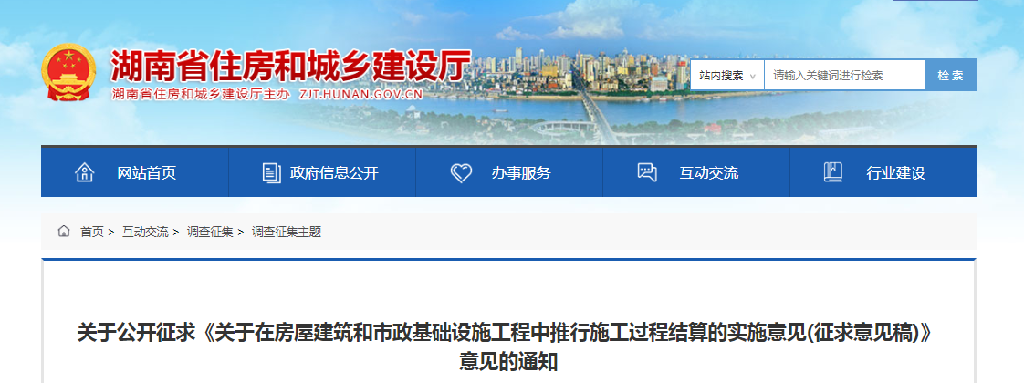 2020年5月28日,湖南省住建廳發(fā)布《關于在房屋建筑和市政基礎設施工程中推行施工過程結算的實施意見(征求意見稿)》,在省內(nèi)房建、市政項目中全面推行施工過程結算。