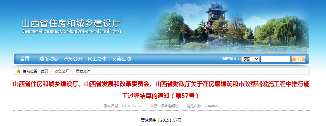 2019年3月22日,《山西省住房和城鄉(xiāng)建設廳、山西省發(fā)展和改革委員會、山西省財政廳關于在房屋建筑和市政基礎設施工程中推行施工過程結算的通知(第57號)》(以下簡稱《通知》)發(fā)布,從5月1日起,在房建和市政工程中推行施工過程結算: