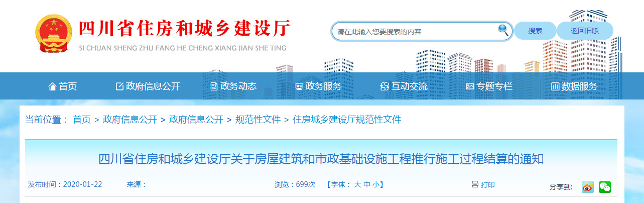 2020年1月22日,四川發(fā)文,全省房屋建筑和市政基礎設施工程施工合同工期兩年以上的新開工項目要積極推行施工過程結算。從2020年3月1日起執(zhí)行,有效期5年。