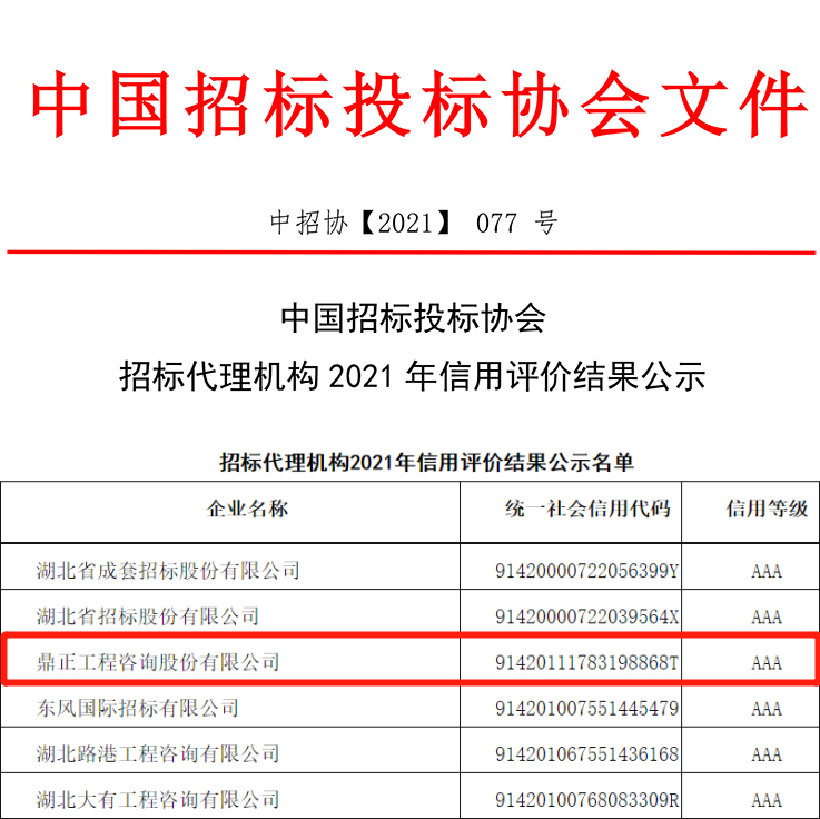 近日,中國招標投標協(xié)會頒布了招標代理機構(gòu)2021年信用評價結(jié)果公示,鼎正工程咨詢股份有限公司繼獲得2021年度工程造價咨詢企業(yè)AAA信用評級后,再榮獲招標代理機構(gòu)AAA信用評級!