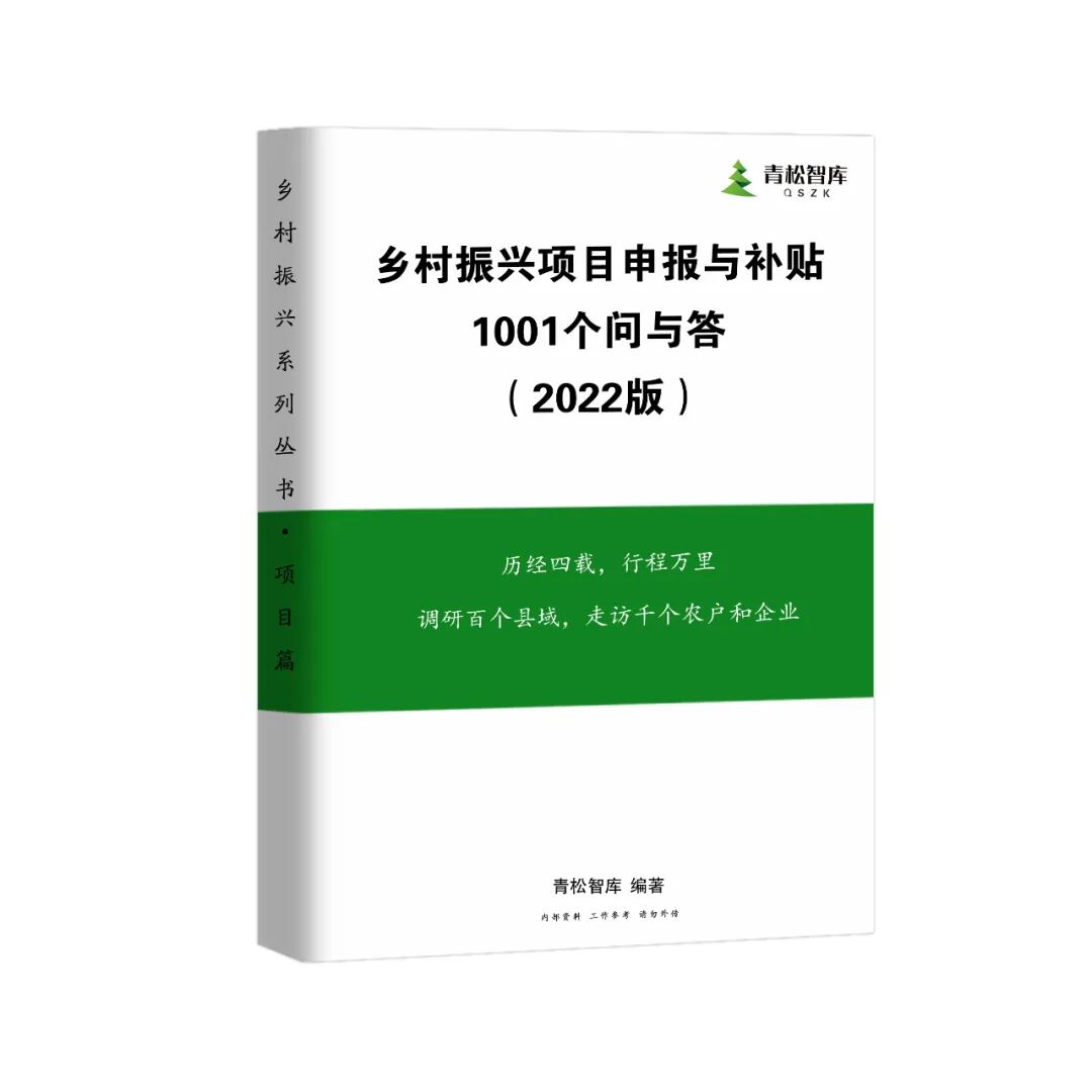 歷經(jīng)四載,行程萬里,調(diào)研百個縣域,走訪千家農(nóng)戶(或企業(yè)),凝聚匠心,由青松智庫編制的《鄉(xiāng)村振興項目申報與補貼1001個問與答》內(nèi)部資料,數(shù)量有限,是常用工作參考工具書,有需要的請加緊與青松智庫聯(lián)系。