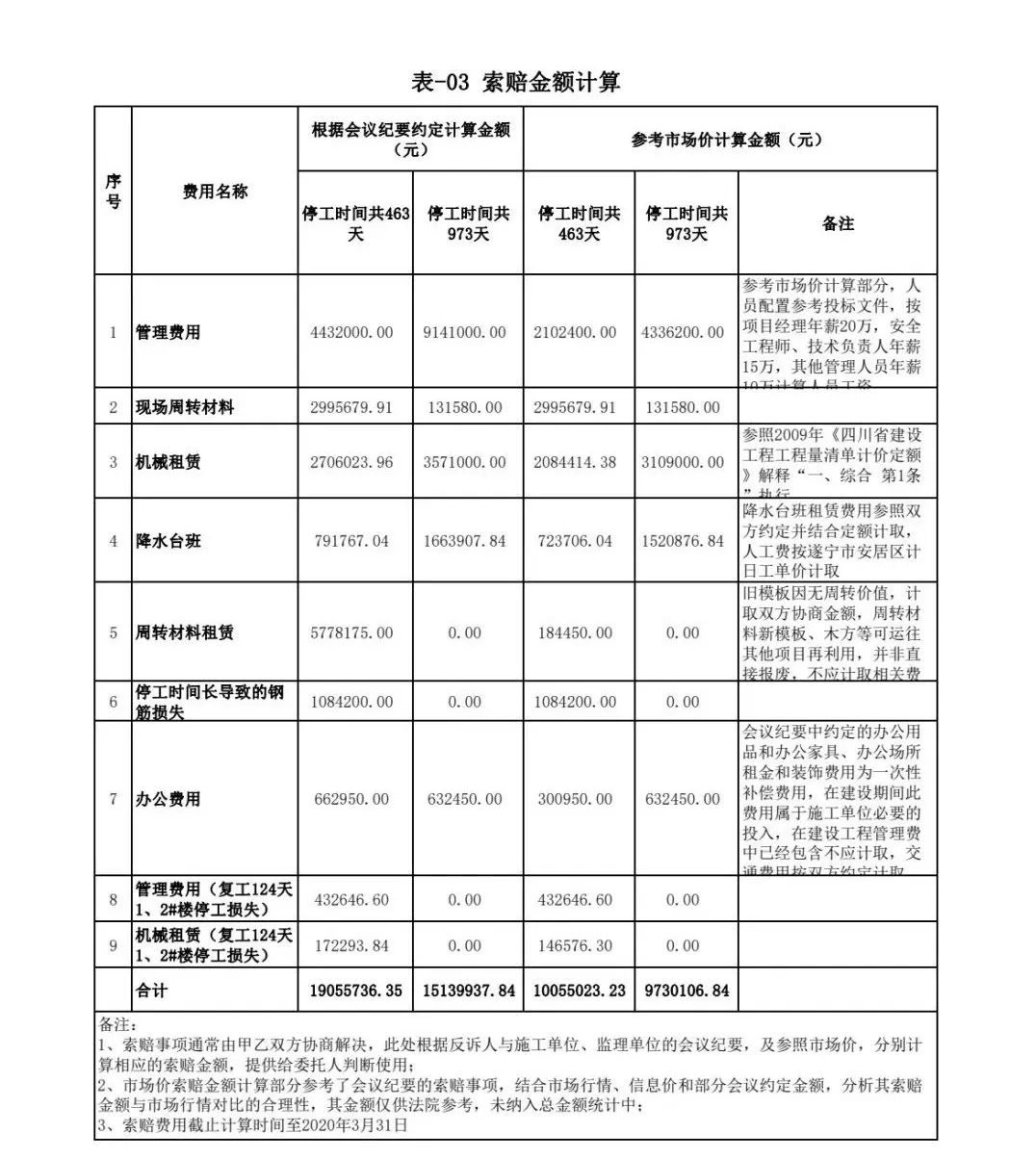 政府與開發(fā)公司之間的合同已解除,但鑒定時,開發(fā)公司與施工單位之間簽訂的施工合同并未解除。項目公司管理費的時間節(jié)點判定就成了一個難題。鑒定人經(jīng)多次內(nèi)部討論,最終確定:將項目公司管理費列為推斷性金額,且根據(jù)不同方案分別統(tǒng)計金額,提交法院參考(具體數(shù)據(jù)詳表-03):