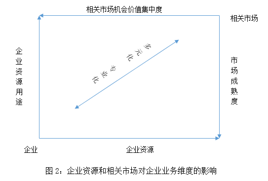 當(dāng)前我國(guó)城建領(lǐng)域市場(chǎng)成熟度較低,市場(chǎng)價(jià)值集中度不高,比較適合進(jìn)行多元化經(jīng)營(yíng)。另外,企業(yè)的資源能力也決定了企業(yè)從事某項(xiàng)業(yè)務(wù)所可能實(shí)現(xiàn)的價(jià)值,企業(yè)在某項(xiàng)業(yè)務(wù)上的資源能力越強(qiáng),說(shuō)明企業(yè)在這項(xiàng)業(yè)務(wù)上的相對(duì)能力就較強(qiáng)。城投公司的多元化維度和規(guī)模主要由這兩種因素決定,如圖2所示: