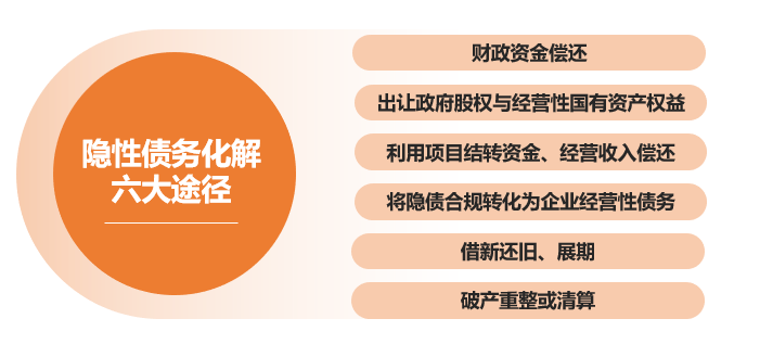 根據(jù)2018年8月財(cái)政部印發(fā)的《地方全口徑債務(wù)清查統(tǒng)計(jì)填報(bào)說明》第十五條,隱性債務(wù)化解包括六大途徑: