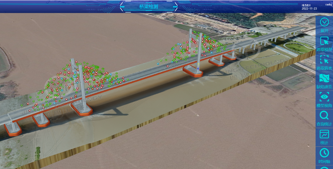 根據(jù)拍攝的高清圖像重建橋梁三維模型,并定量標(biāo)示各類缺陷的位置,并且搭建獨立的大數(shù)據(jù)云平臺,實現(xiàn)橋梁缺陷與病害的可視化,對橋梁問題進行三維立體化復(fù)現(xiàn),為橋梁安全運行提供數(shù)據(jù)支撐。
