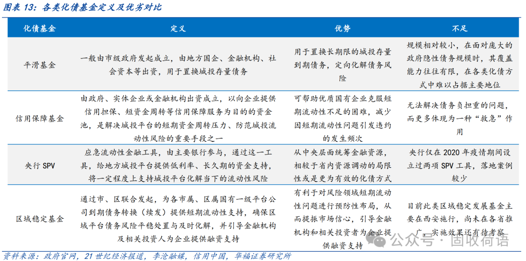 設(shè)立“化債基金”作為地方政府有效的管控城投債務(wù)風(fēng)險(xiǎn)的手段,被各地廣泛運(yùn)用,包括平滑基金、信用保障基金、央行SPV等?;鹳Y金主要來源于省內(nèi)/市內(nèi),調(diào)動(dòng)的是區(qū)域內(nèi)的金融資源,但規(guī)模相對(duì)有限;SPV在投放貸款的同時(shí)或要求抵押品,因此國有資源更為豐富的區(qū)域預(yù)計(jì)將獲得更大的支持。