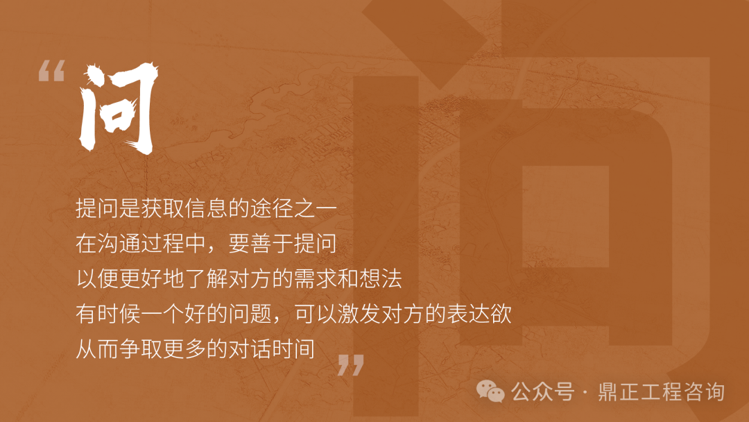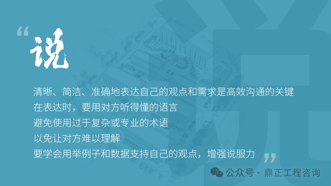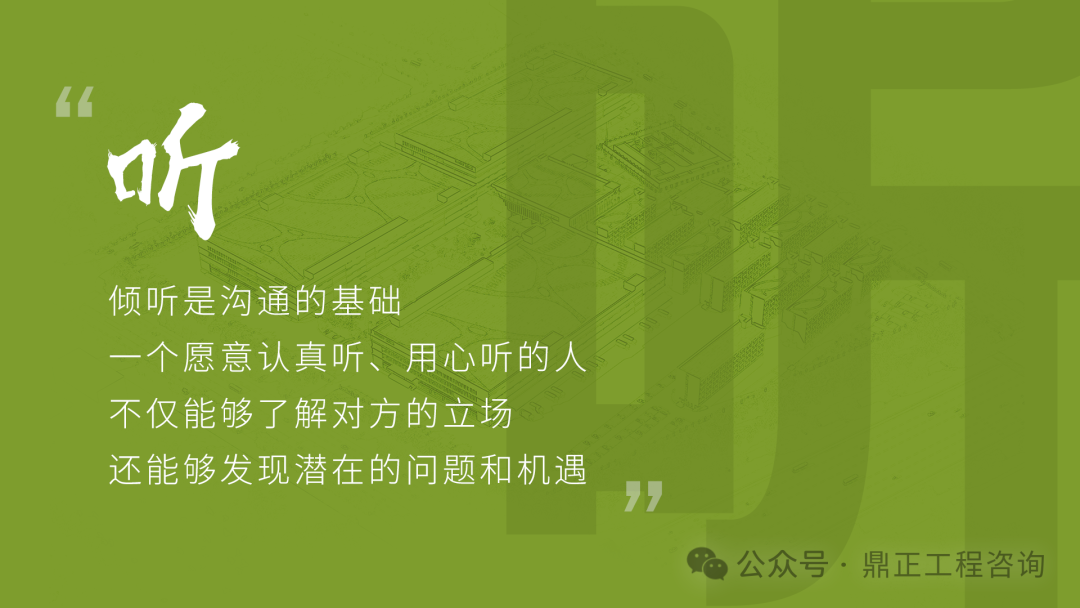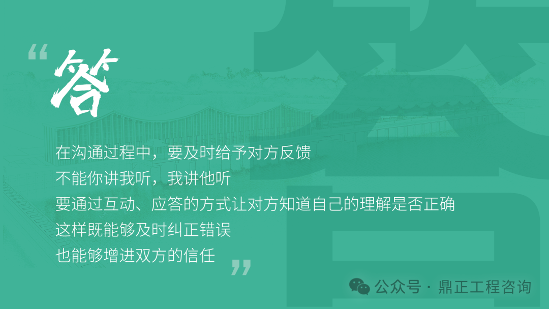 交流要看對象,不能對牛彈琴。與農(nóng)民工交流要用農(nóng)民工聽得懂的語言;與同行或其他咨詢機構(gòu)交流要用專業(yè)語言;與直接上級交流要及時反饋并提出合理建議;與客戶交流,要從客戶的視角出發(fā),為其提供最優(yōu)解決方案。