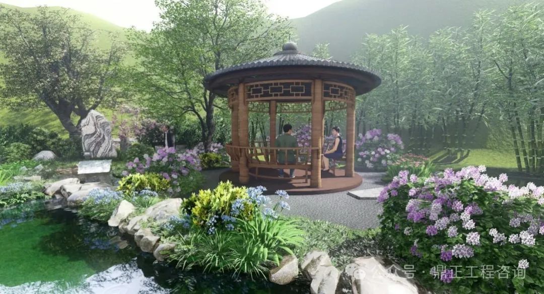 水景觀水文化打造:通過深挖相公泉?dú)v史文化內(nèi)涵,進(jìn)行本地印象提煉?!跋喙币辉~在古代,是妻子對(duì)丈夫的稱呼,也是君子、生員(秀才、相公)、宰相的另一種叫法。君子愛茶,沏茶品茗,修煉品性,以茶可雅志,茶是象征著塵世的純潔。設(shè)計(jì)從自然山水出發(fā),落位于閑情逸致設(shè)計(jì)基調(diào),泉眼處采用題字景石配上一棵姿態(tài)旖旎的紅豆,視線端頭一幅竹影錦鯉、花木跌水的畫面映入眼簾,兩側(cè)的樹木林立,開合有致,整個(gè)節(jié)點(diǎn)的中心是一座圓頂茶亭,在亭中,一壺清茶問道,仿佛拉近了古今往事,也增加了場(chǎng)地的記憶,呈現(xiàn)出 “千年古樹頻招手,萬年清泉溢清香”的意境。