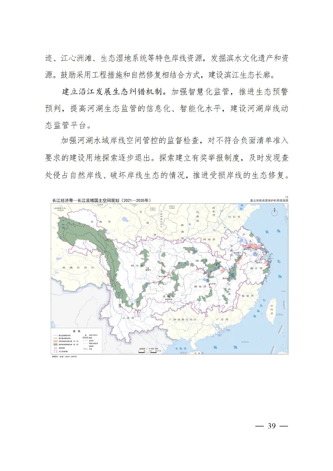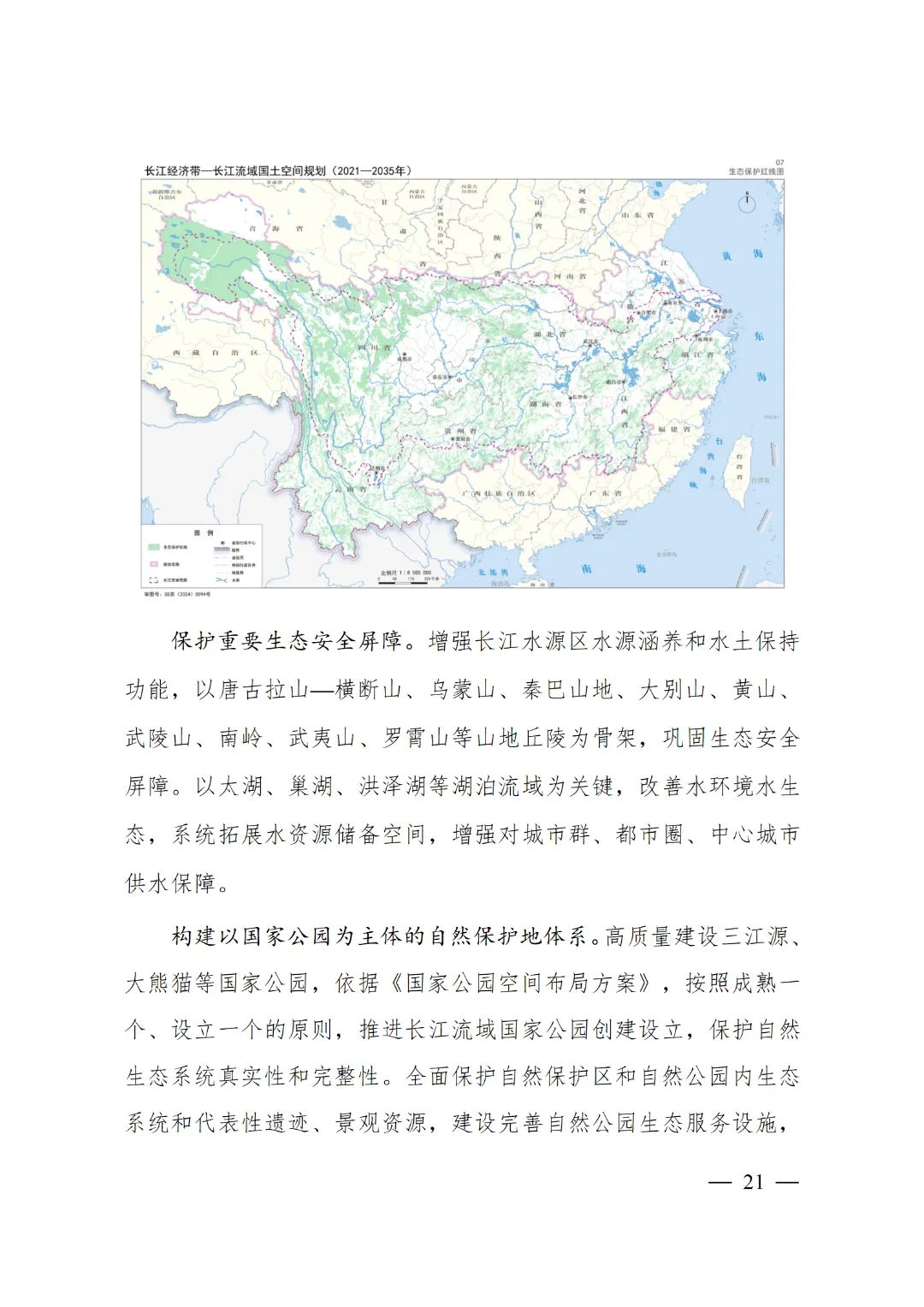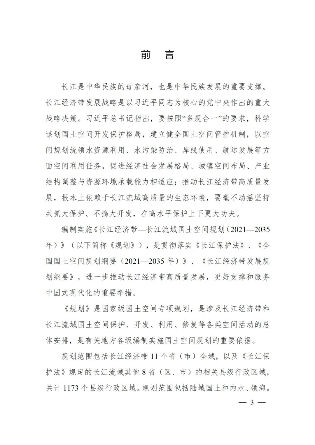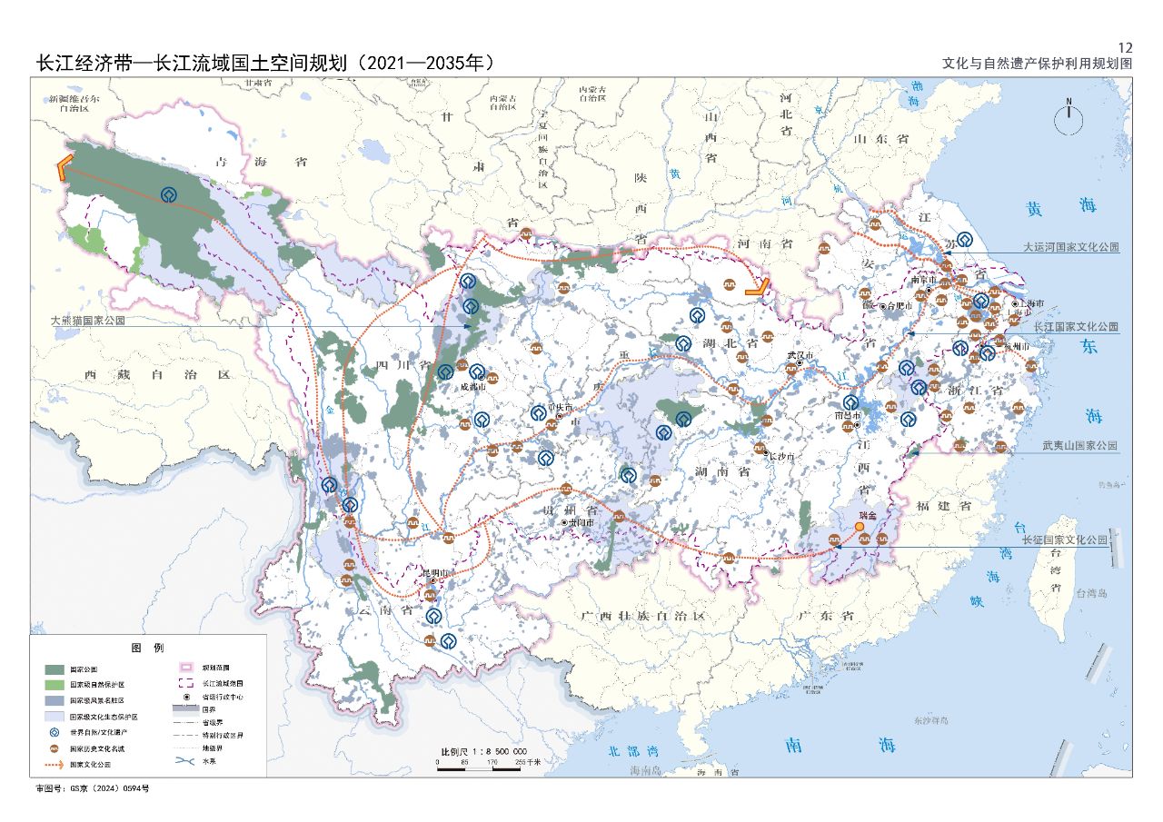 2024年2月9日,《長江經(jīng)濟帶—長江流域國土空間規(guī)劃(2021—2035年)》經(jīng)國務(wù)院批復(fù)同意。9月10日,自然資源部正式印發(fā)《長江經(jīng)濟帶—長江流域國土空間規(guī)劃(2021—2035年)》。規(guī)劃范圍包括長江經(jīng)濟帶11個省(市)全域,以及《長江保護法》規(guī)定的長江流域其他8?。▍^(qū)、市)的相關(guān)縣級行政區(qū)域,共計1173個縣級行政區(qū)域。規(guī)劃范圍包括陸域國土和內(nèi)水、領(lǐng)海。其中,陸域面積240萬平方公里。(后附規(guī)劃范圍詳細表格)規(guī)劃期限為2021年至2035年。