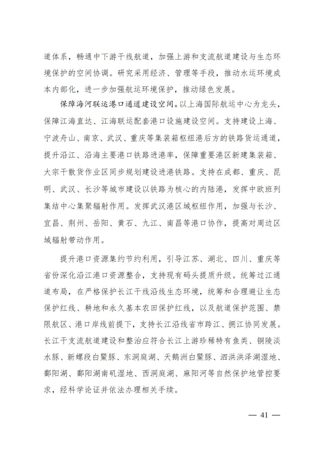 以上海國際航運中心為龍頭,保障江海直達、江海聯(lián)運配套港口設(shè)施建設(shè)空間。支持建設(shè)上海、寧波舟山、南京、武漢、重慶等集裝箱樞紐港后方的鐵路貨運通道,提升沿江、沿海主要港口鐵路進港率,保障重要港區(qū)新建集裝箱、大宗干散貨作業(yè)區(qū)同步規(guī)劃建設(shè)進港鐵路。