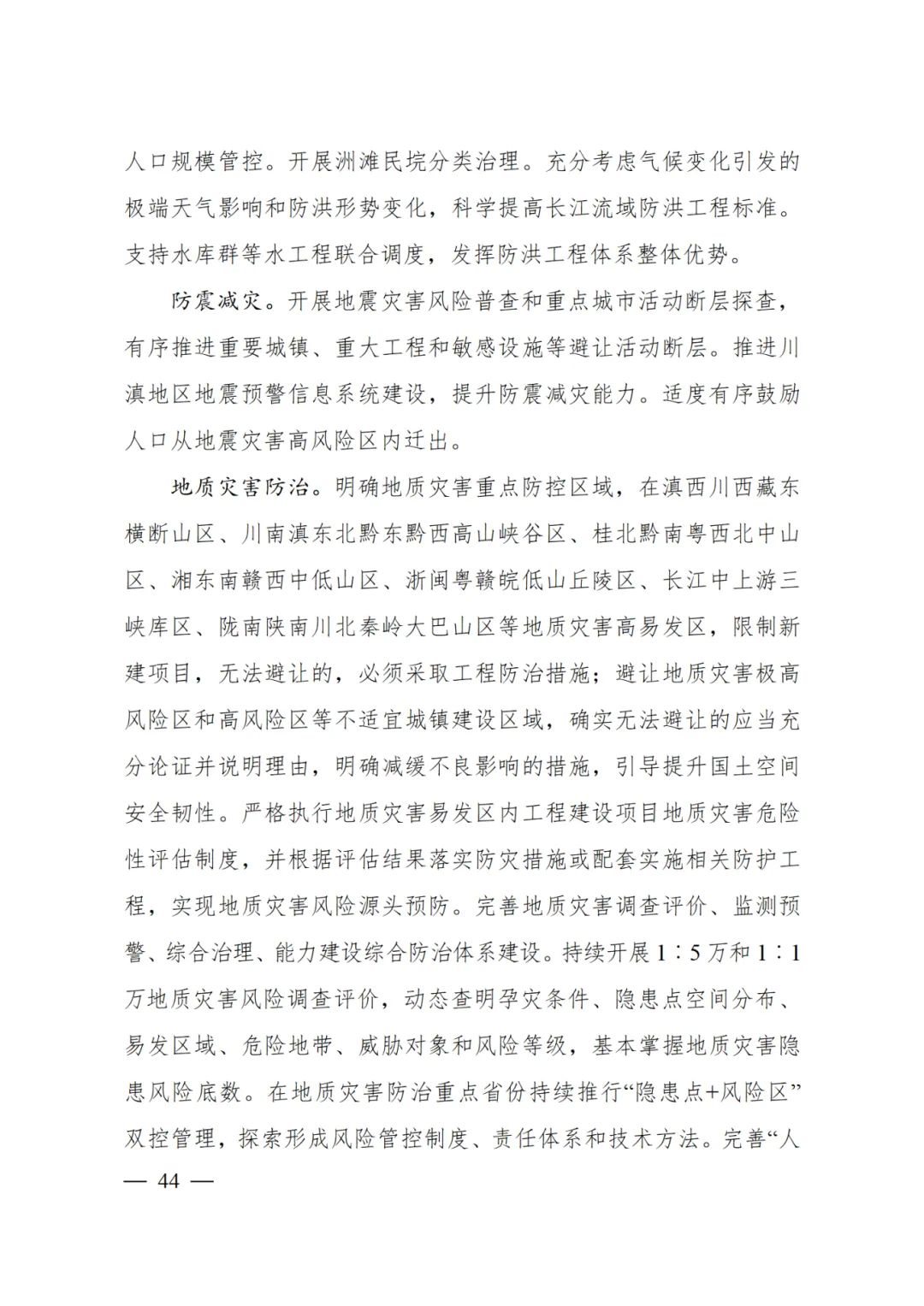 地質(zhì)災(zāi)害防治 明確地質(zhì)災(zāi)害重點防控區(qū)域,在滇西川西藏東橫斷山區(qū)、川南滇東北黔東黔西高山峽谷區(qū)、桂北黔南粵西北中山區(qū)、湘東南贛西中低山區(qū)、浙閩粵贛皖低山丘陵區(qū)、長江中上游三峽庫區(qū)、隴南陜南川北秦嶺大巴山區(qū)等地質(zhì)災(zāi)害高易發(fā)區(qū),限制新建項目,無法避讓的,必須采取工程防治措施;避讓地質(zhì)災(zāi)害極高風(fēng)險區(qū)和高風(fēng)險區(qū)等不適宜城鎮(zhèn)建設(shè)區(qū)域,確實無法避讓的應(yīng)當(dāng)充分論證并說明理由,明確減緩不良影響的措施,引導(dǎo)提升國土空間安全韌性。