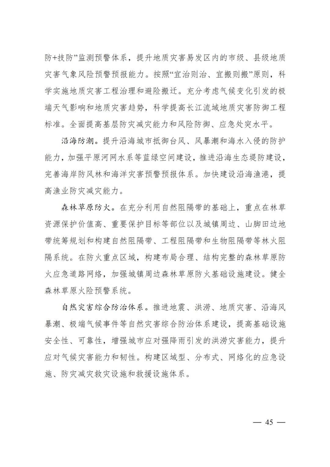 推進地震、洪澇、地質(zhì)災(zāi)害、沿海風(fēng)暴潮、極端氣候事件等自然災(zāi)害綜合防治體系建設(shè),提高基礎(chǔ)設(shè)施安全性、可靠性,增強城市應(yīng)對強降雨引發(fā)的洪澇災(zāi)害能力,提升應(yīng)對氣候災(zāi)害能力和韌性。構(gòu)建區(qū)域型、分布式、網(wǎng)絡(luò)化的應(yīng)急設(shè)施、防災(zāi)減災(zāi)救災(zāi)設(shè)施和救援設(shè)施體系。