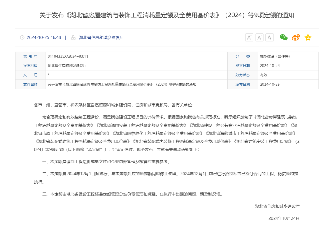▲《湖北省房屋建筑與裝飾工程消耗量定額及全費(fèi)用基價表》(2024)等9項定額正式發(fā)布