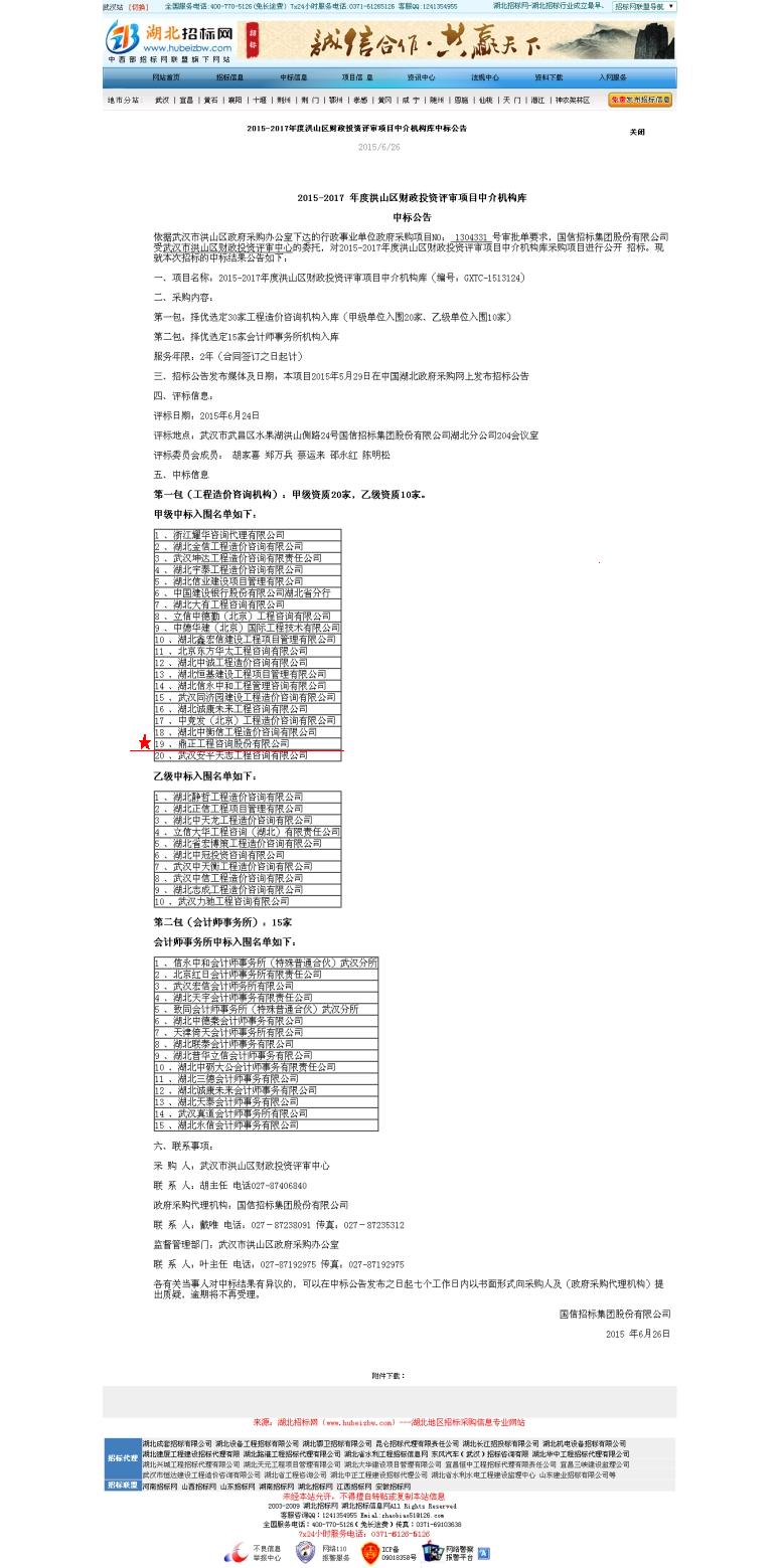 【經(jīng)營成果】我司入圍2015-2017 年度洪山區(qū)財(cái)政投資評(píng)審項(xiàng)目中介機(jī)構(gòu)庫