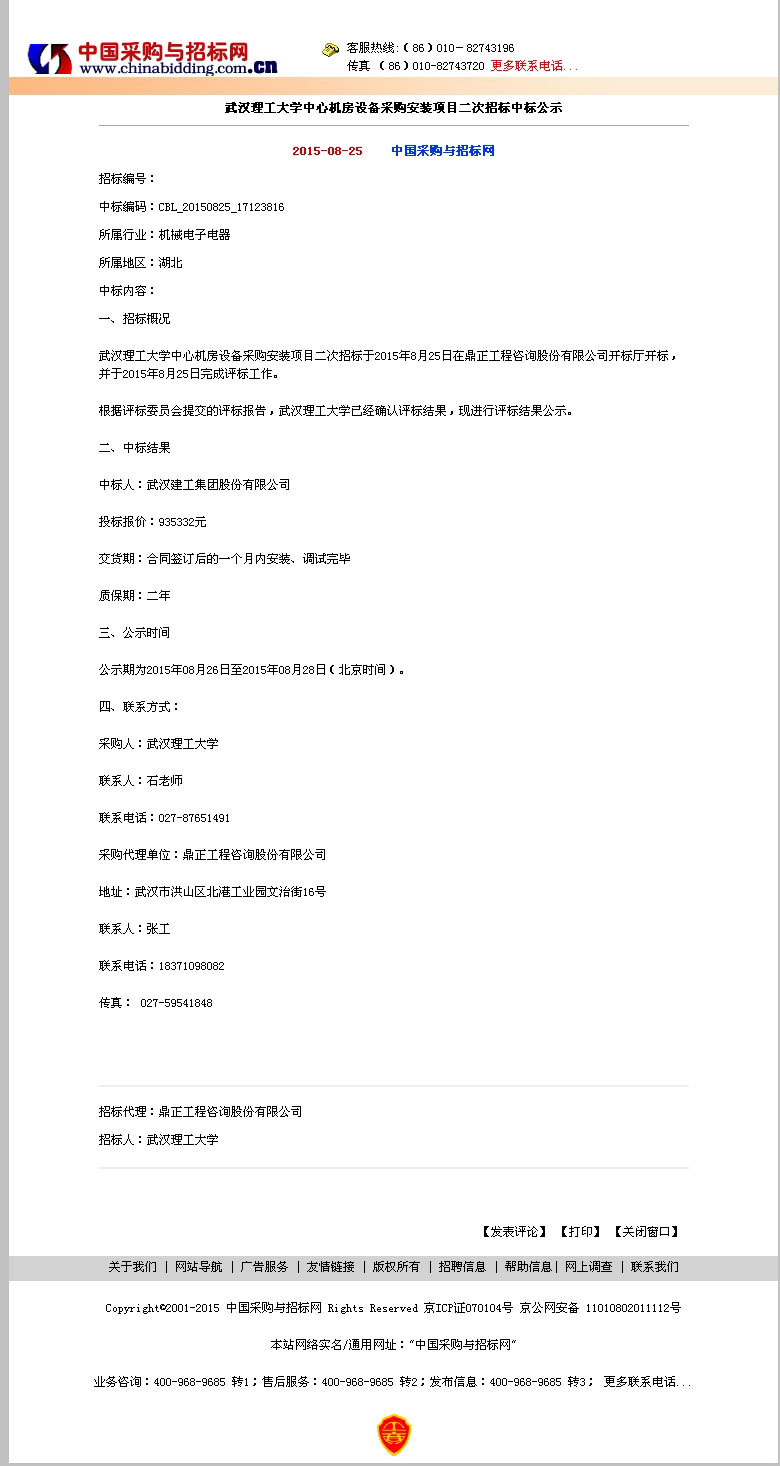 武漢理工大學(xué)中心機房設(shè)備采購安裝項目二次招標中標公示