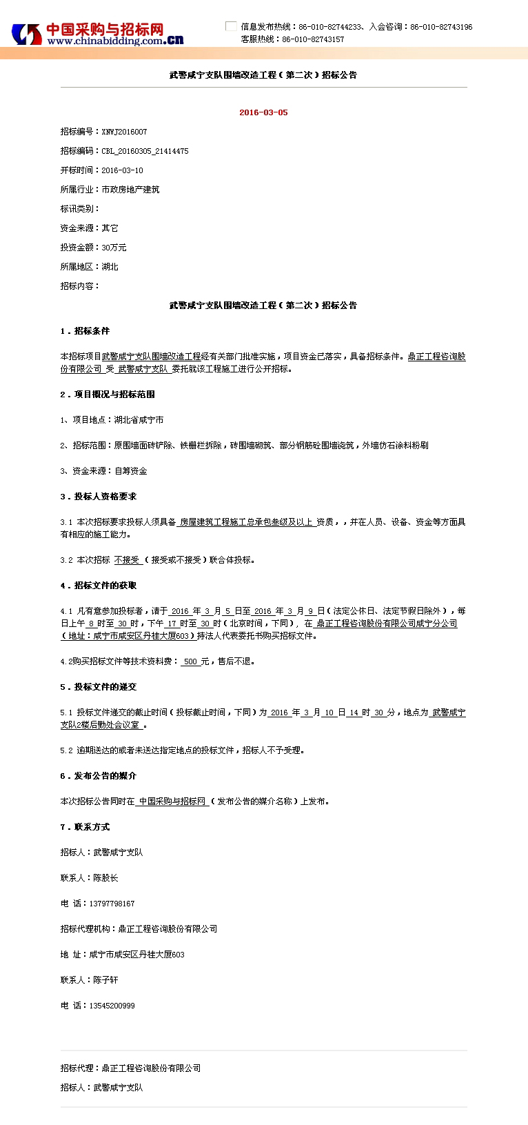 武警咸寧支隊(duì)圍墻改造工程(第二次)招標(biāo)公告