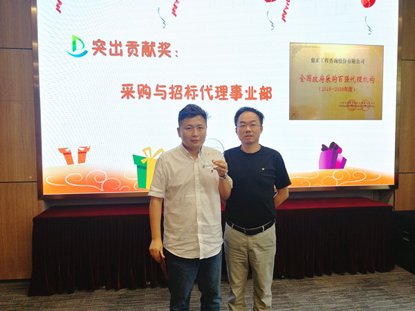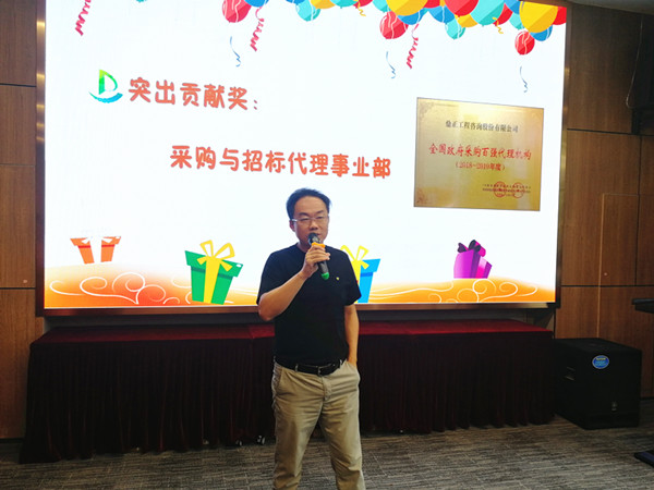 值得一提的是,今年七月我司憑借專業(yè)的服務、完善的內(nèi)控制度從近千家政府采購代理機構中脫穎而出,獲得首屆“全國政府采購百強代理機構(2018-2019年度)”榮譽稱號,這一榮譽稱號離不開采購與招標事業(yè)部全體成員積極主動的參評。董事長王雁然為采購與招標事業(yè)部頒發(fā)突出貢獻獎,并號召大家向采購與招標事業(yè)部學習大局意識和吃苦耐勞的工作作風。