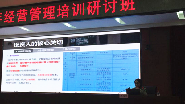 王雁然董事長(zhǎng)從“PPP的發(fā)展趨勢(shì)”、“PPP概述”、“PPP政策”和“PPP全生命周期實(shí)務(wù)操作”四個(gè)方面進(jìn)行了全面系統(tǒng)的講解,PPP高級(jí)項(xiàng)目經(jīng)理王海蓮結(jié)合《京山市武荊高速公路連接線七寶山部分礦山地質(zhì)環(huán)境恢復(fù)治理工程PPP項(xiàng)目》(以下簡(jiǎn)稱(chēng)“七寶山PPP項(xiàng)目”)案例分享了投資人的核心關(guān)切與解決方案。七寶山PPP項(xiàng)目是地礦系統(tǒng)參與的第一個(gè)PPP項(xiàng)目,也是湖北省首個(gè)礦山地質(zhì)環(huán)境恢復(fù)治理工程采用PPP模式實(shí)施的項(xiàng)目。王海蓮經(jīng)理分析了該項(xiàng)目從策劃到落地全過(guò)程的核心關(guān)切點(diǎn),并對(duì)項(xiàng)目在執(zhí)行過(guò)程中可能會(huì)出現(xiàn)的風(fēng)險(xiǎn)點(diǎn)給出相應(yīng)建議方案。