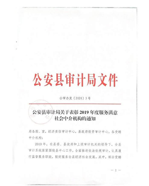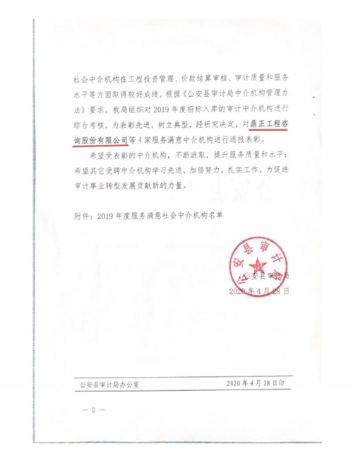 自2019年7月1日鼎正咨詢成為公安縣審計局的入庫合作單位以來,荊州分公司同事們在工程竣工結(jié)算審計過程中,精心組織、合理安排、嚴(yán)于律己、廉潔從審,在確保重點工程順利推進、節(jié)約政府資金、提高投資效益等方面做出了突出貢獻,得到了公安縣相關(guān)單位的一致好評,為公司贏得了信譽。
