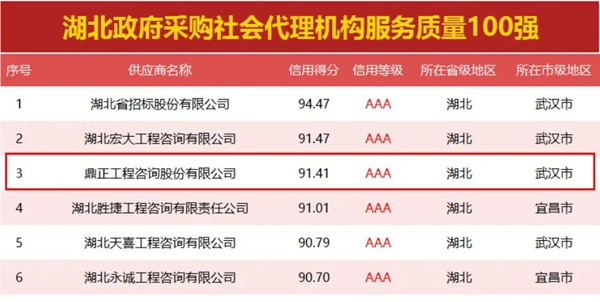 鼎正印記丨名列三甲 榮登湖北政府采購社會代理機構(gòu)服務質(zhì)量百強榜